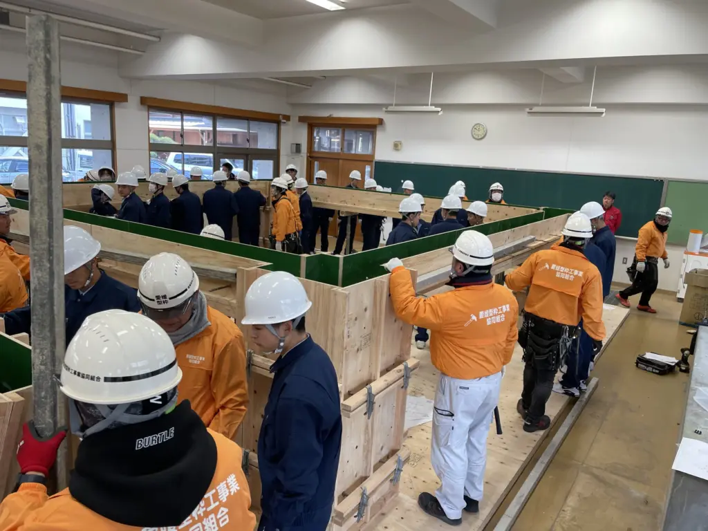 愛媛型枠工事業協同組合で令和6年1月25日に松山工業高校土木科1年生に出前講座を行いました。当組合では初の試みでしたが組合員の皆様、賛助企業の皆様のご協力の元、無事開催することが出来ました。